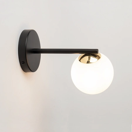 - Czarno-złoty kinkiet z białym kulistym kloszem, może być stosowany jako oświetlenie nad lustro. Klosz okrągły, biały o średnicy 12 cm.