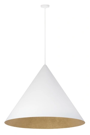 Lampa wisząca VESUVIO dostępna jest w kilku wersjach kolorystycznych. Prezentowany model to wariant w kolorze białym. Jej wnętrze to niejednolita struktura w kolorze złota, która po oświetleniu tworzy niepowtarzalny efekt wizualny. Zaletą oprawy jest fakt, że pomimo swoich imponujących rozmiarów (wysokość samego klosza to 67 cm) lampa nie jest ciężka. Łatwo też ją utrzymać w czystości. Nowoczesna lampa w kształcie stożka VESUVIO będzie się świetnie prezentować w kompozycji z pozostałymi modelami z tej rodziny, jak również zawieszona pojedynczo.