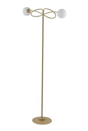 - Nowoczesna złoto-beżowa lampa podłogowa z okrągłymi mlecznymi kloszami.