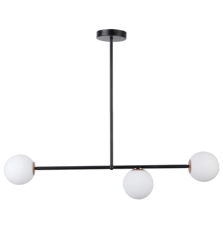 - Czarno-biała lampa sufitowa z kulistymi, szklanymi kloszami. Model z trzema punktami świetlnymi.