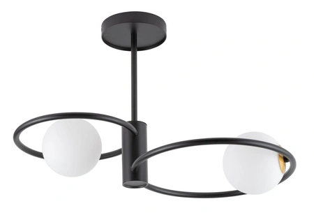 - Czarna lampa sufitowa – okręgi z mlecznymi kloszami kulami.