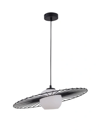 - Czarna, druciana lampa wisząca ze szklanym, mlecznym kloszem. Model z jednym punktem świetlnym. Wysokość lampy można regulować na przewodzie.