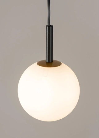 - Czarna lampa wisząca kula z mlecznym kloszem o średnicy 14 cm. Możliwość wydłużenia przewodu na zamówienie.