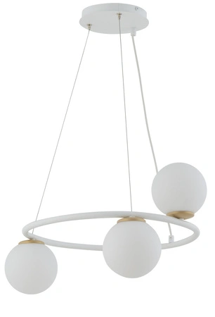 - Biała lampa wisząca na kole z mlecznymi kloszami. Model z 3 punktami świetlnymi. Średnica kloszy: 12 cm.