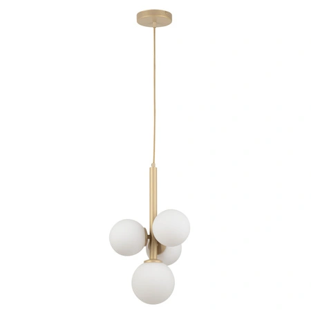 - Lampa wisząca z mlecznymi kulistymi kloszami. Kolor – złoty beż.