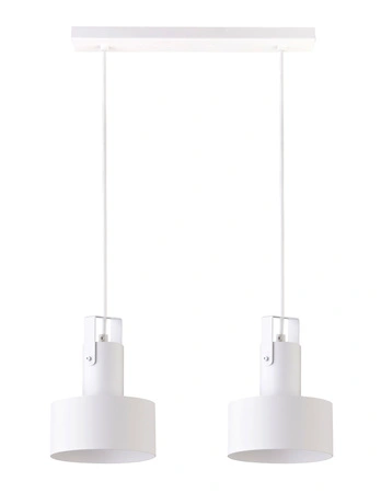 - Biała, metalowa lampa wisząca w stylu loftowym. Model z 2 punkami świetlnymi