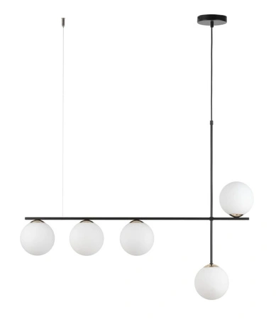 - Nowoczesna lampa wisząca z mlecznymi kloszami kulami. Model z 5 punktami świetlnymi. Klosze o średnicy 14 cm.