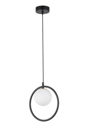 - Czarna lampa wisząca ring z mlecznym kulistym kloszem