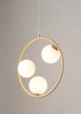 - Złoto-beżowa lampa wisząca ring z mlecznymi kloszami kulami.