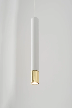 - Biała lampa wisząca typu sopel ze złotą końcówką.