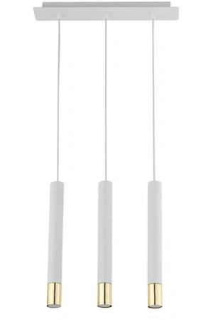 - Biała lampa wisząca ze złotymi końcówkami. Lampa z rurek z 3 punktami świetlnymi.