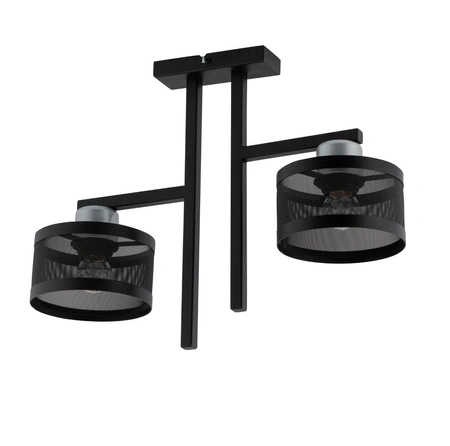 - Czarno-srebrna, nowoczesna lampa sufitowa z kloszami z siatki. Plafon z dwoma punktami świetlnymi, wykonany ze stali lakierowanej.