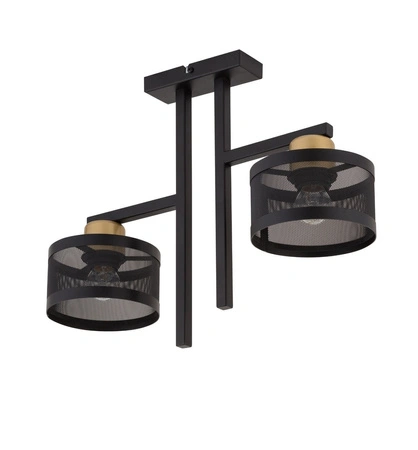 - Czarno-złota, nowoczesna lampa sufitowa z kloszami z siatki. Plafon z dwoma punktami świetlnymi, wykonany ze stali lakierowanej.