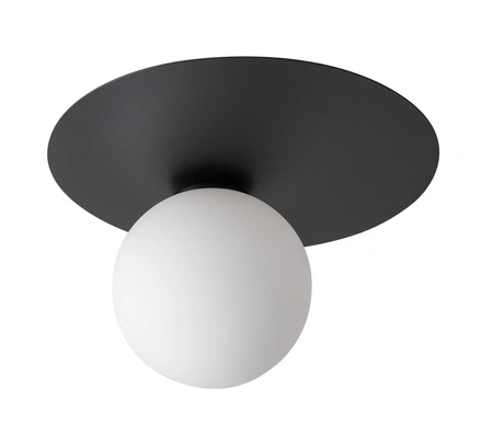 - Czarno-biały plafon ze szklanym kulistym kloszem. Lampę można montować jako kinkiet ścienny.