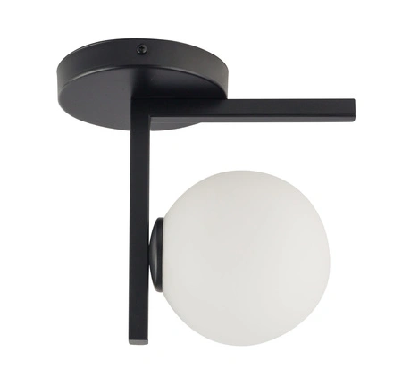 - Czarny plafon z białym, kulistym kloszem. Nowoczesna lampa sufitowa z 1 punktem świetlnym.