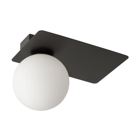 - Czarno-biały plafon ze szklanym kulistym kloszem. Lampę można montować jako kinkiet ścienny.