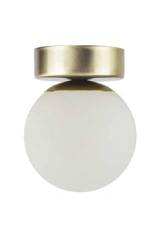 Lampa sufitowa PERLA LUX 1 to niewielki, mleczny, szklany klosz (jego średnica wynosi 10 cm), który umieszczono na podsufitce w złotym kolorze wykonanej ze szczotkowanej stali mosiądzowanej. Zastosowane do produkcji materiały dają pewność odporności lampy na codzienne użytkowanie i gwarancję długotrwałego, estetycznego wyglądu.
