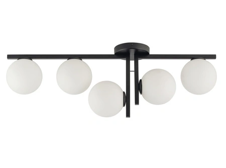 - Czarny plafon z białymi, kulistymi kloszami. Nowoczesna lampa sufitowa z 5 punktami świetlnym.