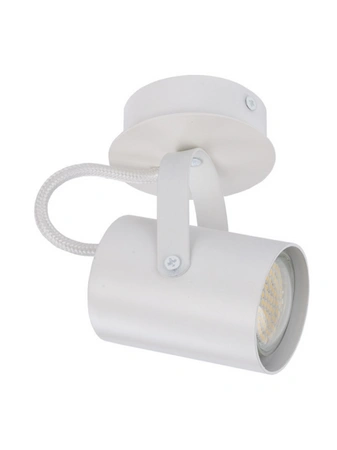 - Biała lampa sufitowa typu reflektor z jednym punktem świetlnym.
